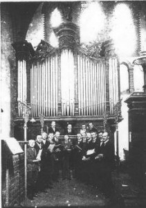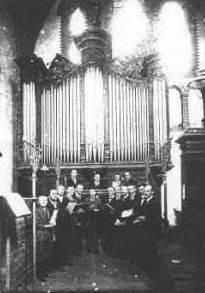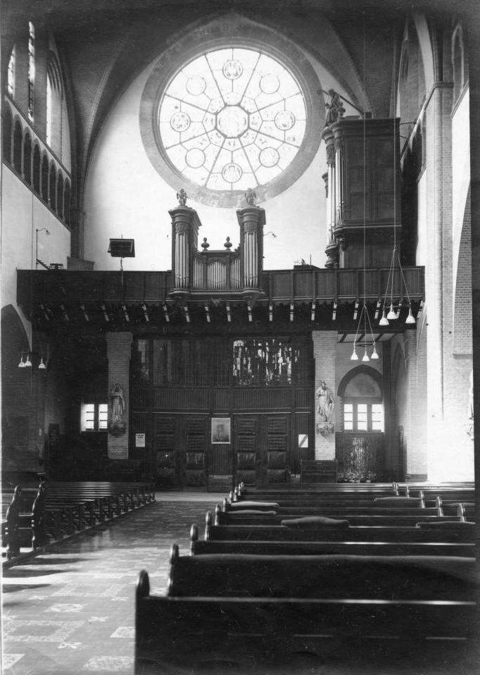 Gebrs. Franssen, Roermond 1902, het kwam tegen de rechterzijkant van het oxaal te staan, het positief vanzelfsprekend aan de balustrade en de windvoorziening onder het roosvenster. Vermoedelijk werd voor deze opstelling gekozen om het roosvenster vrij te houden. |